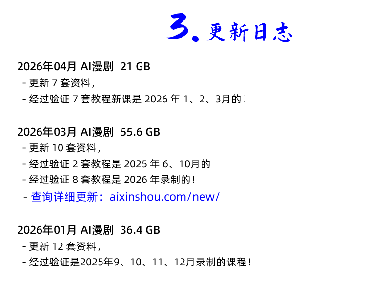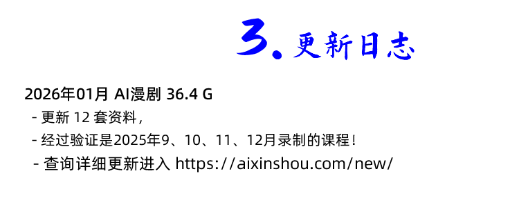 2026年开始 AI漫剧 新课 请自行去更新日志页面查询该课程每次对应的文件更新: